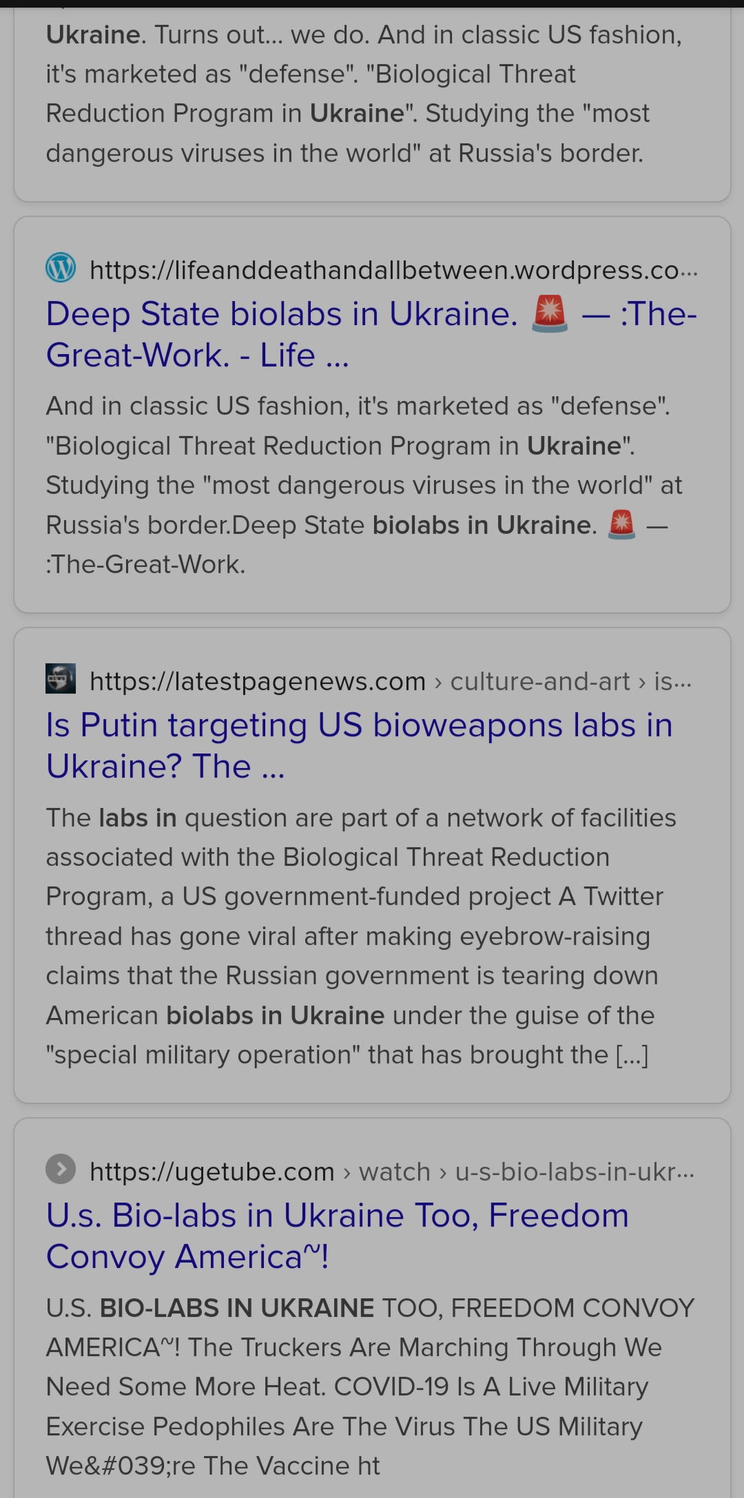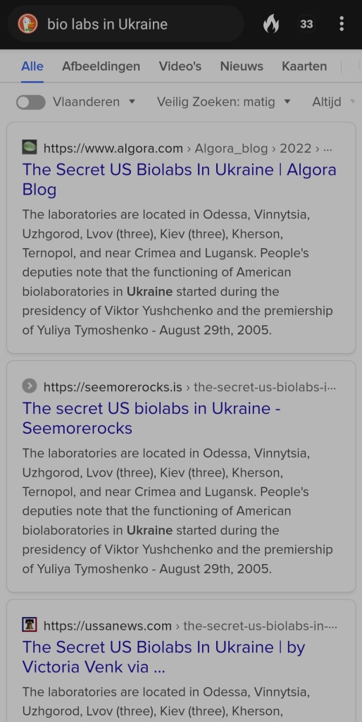 A simple Google ….no sorry ... incognito Duckduckgo Search - 'Ukraines secret bio labs' reveals a number of different website links that discusses either the fake reporting of or the actual real existence of these labs and the impact they supposedly already had within the communities where they were located.